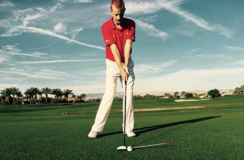 在打短铁杆时,为了增加控球型和让击球更扎实,我们通常习惯使用“杆身前倾法”击球。所谓“杆身前倾法”,就是设定站姿准备打短铁时,球位位于站位的中间,就是双手位置在杆头前面,身体重心的60%放在目标同侧的腿上,这样击球时下杆会积极主动。
