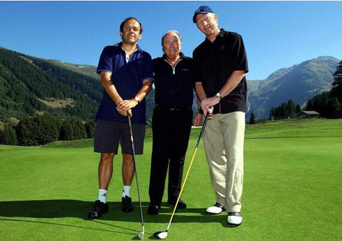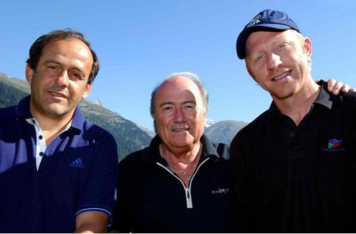 1.布拉特与普拉蒂尼及德国网球名宿贝克尔在瑞士的一座高尔夫球场合影。