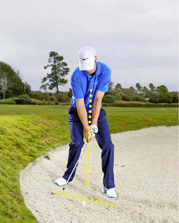 相反,需要将身体倾斜,角度与沙面坡度一致。身体向旗杆方向倾斜直到感觉双肩与地面平行,可以将一支球杆抵住双肩来检查姿势正确与否。同时,脊柱与坡度垂直,握杆时保持好这个姿势。