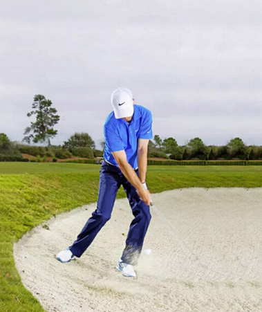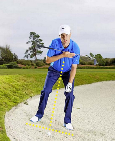 下坡球会带来很多问题,因为击球过程中身体会本能地平衡自身,这意味着重心会均匀分布,脊柱垂直。但是由于小球后方沙面的坡度很高,重心均匀分布不会起到作用,会让球杆扎进小球后方的沙子中。