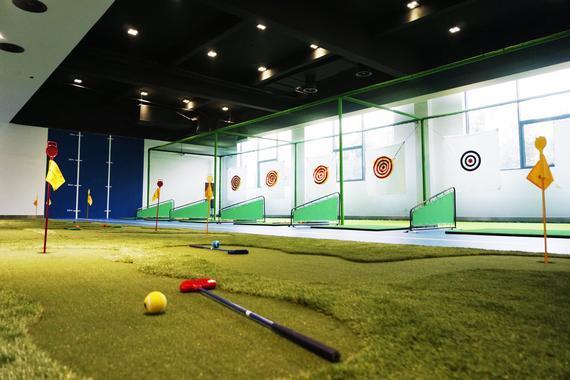 注意,这里说的是“高尔夫场馆”,并不是18洞高尔夫球场,也不是9洞高尔夫球场,它甚至连练习场都算不上;可是这座面积1500平方米的“高尔夫小球馆”,麻雀虽小,五脏俱全,包括了12个打位,15个迷你果岭,一个大果岭,一个沙坑,以及一个模拟练习器。对于初学者而言,它已经堪比一座高尔夫球场了,因为你可以在这里练习挥杆、切推、甚至可以在模拟器上打一打全世界知名的高尔夫球场,比如:奥古斯塔。