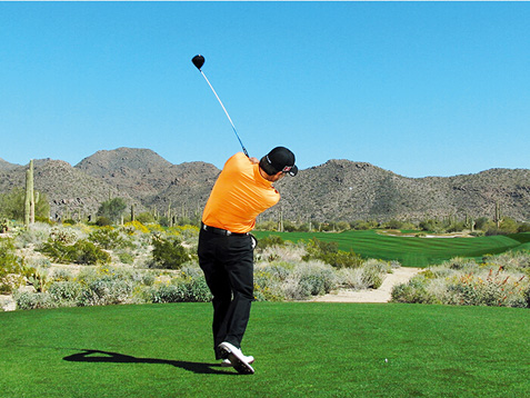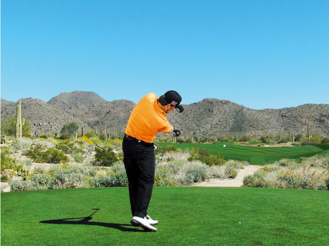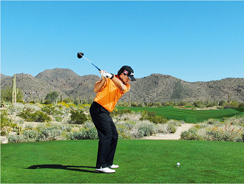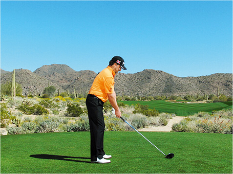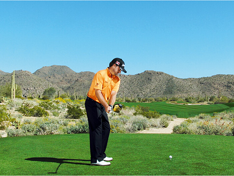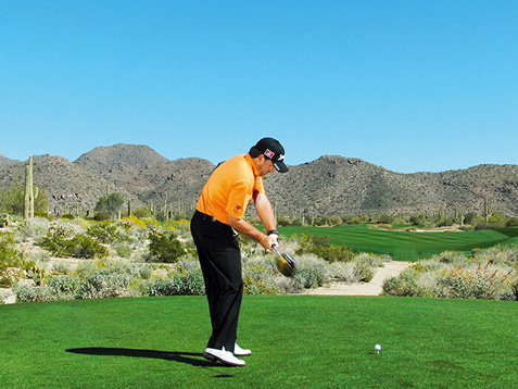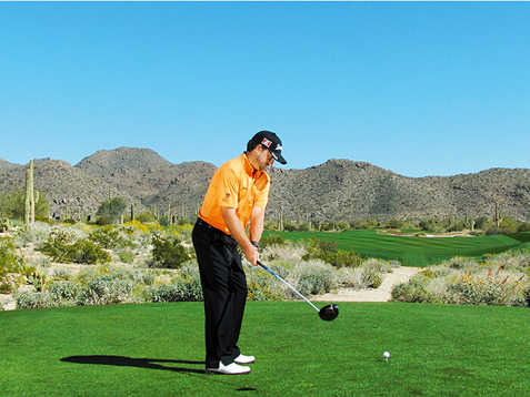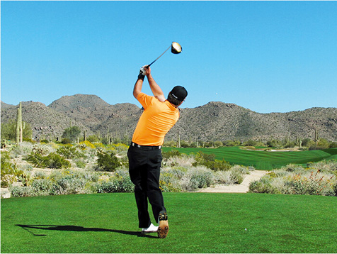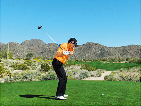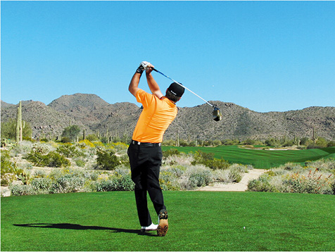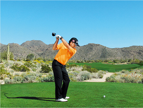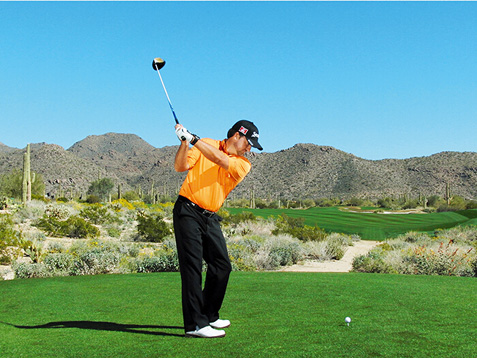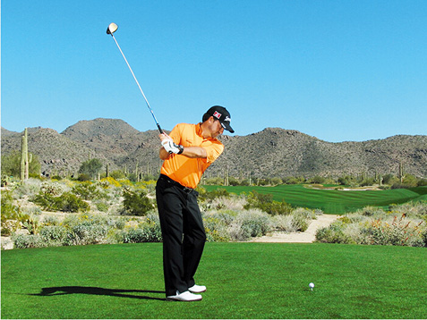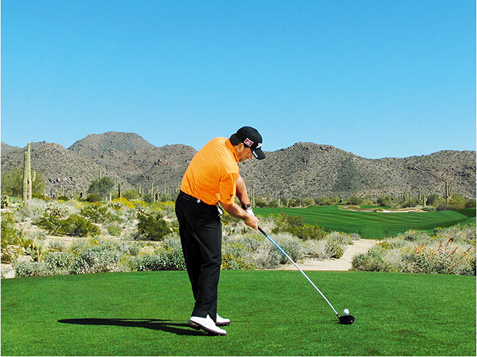 麦克道尔的块头不大,挥杆速度不快,挥杆动作也称不上经典。这些是好消息,因为这说明,哪怕动作不够完美,仍然有机会取得好成绩。麦克道尔在站位时站得太直(正如大多数业余球手一样),上杆时杆头过于偏外(业余球手的又一个常见失误),而且他倾向于在上杆顶点放低球杆(在练习场每时每刻都能看到这样的动作)。但请注意图4、8和 10,在这几个点上,他的球杆都处于完美平面上。学习一下他的挥杆动作,在挥杆关键点上做出正确姿势。到那时,哪怕挥杆不完美,仍然能做出不错的击球。
