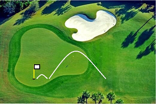 如果球在果岭前30-70码的球道上,旗杆的位置靠后,有足够的滚动空间,劈起球是最适合的打法。职业球员可以打高抛让球直接飞到洞口,但若失了误就是送羊进虎口。所以还是选择9号铁或者挖起杆,球位放在站位中间或者稍微靠后的位置,双手前压,重心靠前。把注意力放在果岭上的落点上,想象球在落地后滚向球洞的场景。然后上杆至一半的位置,加速通过触球区,触球后送杆至杆头指向球洞的位置。劈起球最讲究的就是让身体的转动与手臂的运动保持一致,一定要在触球时坚决抵制手腕去捞球的动作。
