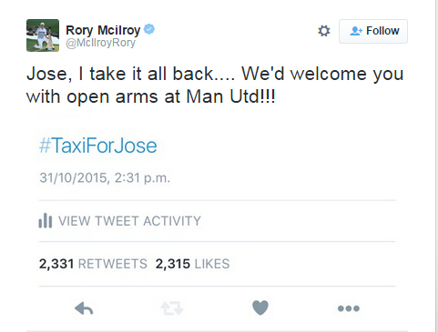 英超豪门切尔西官方宣布正式解雇主帅穆里尼奥。消息传出后不久,前男子高尔夫头号球员罗里-麦克罗伊(Rory Mcilroy)即发布一条推特,为葡萄牙人提供了一条“出路”,呼吁魔力鸟来曼联执教。