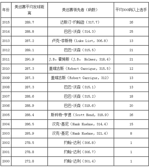 1999年到2002年,约翰-达利是唯一开球平均距离超过300码的选手。接着2003年,8位选手进入了300码的区域之中,包括汉克-基尼(Hank Kuehne),他平均开球321.4码仍旧是美巡赛的纪录。2005年,这个人数创记录地达到26人,与上个赛季持平。