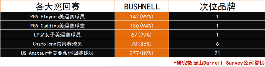 事实上, 在世界各大巡回赛上,Bushnell测距仪都是同类产品中最被信赖的,遥遥领先次位品牌。截至目前,在美巡赛上有142位职业选手选择Bushnell golf测距仪,份额达到99%,次位品牌的使用者仅为1人;美巡赛球童中有136人选用Bushnell golf测距仪,次位品牌使用者仅为1人;LPGA职业球员中有67为选择Bushnell Golf测距仪,次位品牌仅为1人。