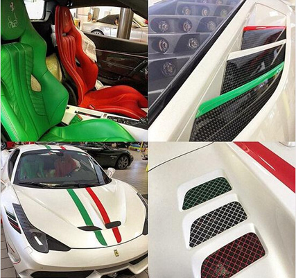 最近这位球手再次20万英镑新添了一年法拉利458,并且在社交网络上爆出了爱车的靓照。白色的车身引擎盖上两根红绿线条显的非常吸引人瞩目,汽车内部红绿色座椅也是非常时尚。