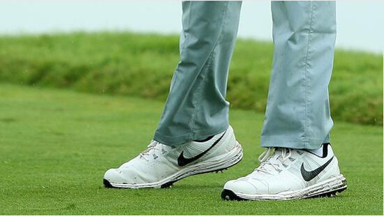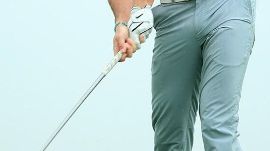 触球瞬间,不要朝目标方向移动左膝,这样会造成挥杆过程中非常大的能量损耗。记住,将左膝牢牢锁定在原来的位置,就像麦克罗伊做的那样。要做到这一点,不必伸直左腿,保证左脚不离地,一直踩在草坪上即可。