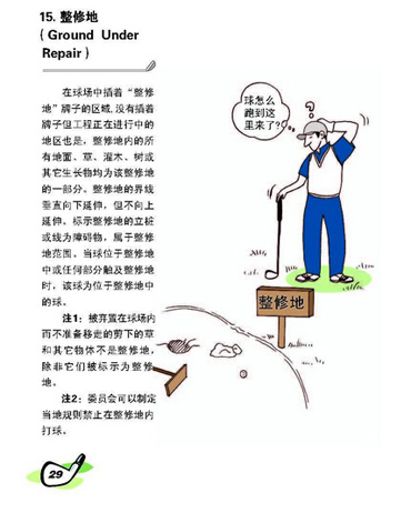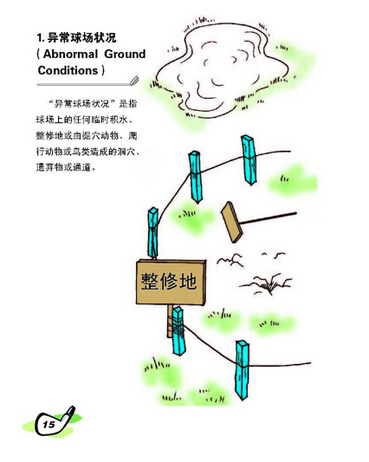 在球场中插着“整修地”牌子的区域,没有插着牌子但工程正在进行中的地区也是,整修地内的所有地面、草、灌木、树或其它生长物均为该整修地的一部分。