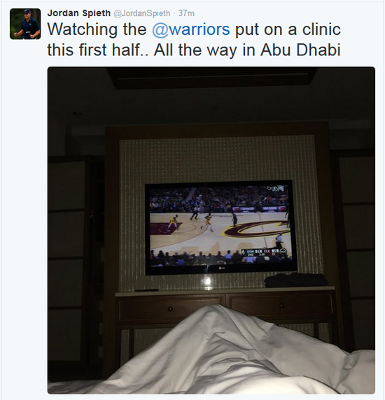 篮球迷斯皮思在推特上上传了一张照片,照片中他正躺在酒店的床上,看着电视中的篮球比赛。他还写道“勇士队上半场打得真精彩…我在阿布扎比”