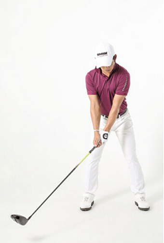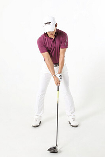 设定动作并无特殊之处,就是一切以方正的对向为塬则,站位也没有特别的宽。站越宽下盘会越稳,但需要越好的回正能力,适当的宽度反而可以促进身体的转动,避免太过用手使力。瞄球姿势比较重视左大腿内侧的稳定,在上杆时可以避免下半身侧移,让上半身的转动可以形成有效的扭力,储存最大的下杆击球力道。