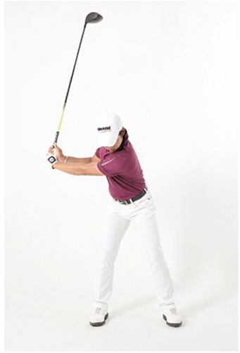 在转动后肩胛骨的同时,两手腕要逐渐跟着曲起,设定好下杆的手腕延迟角度,一当这个角度形成且后肩胛骨也不能再转了,就已经到达上杆顶点。这个顶点位置大约是四分之叁的上杆,球杆位置也不会太高,手部位置固定不会晃动,做到这个要求,才有可能打出更远的距离。