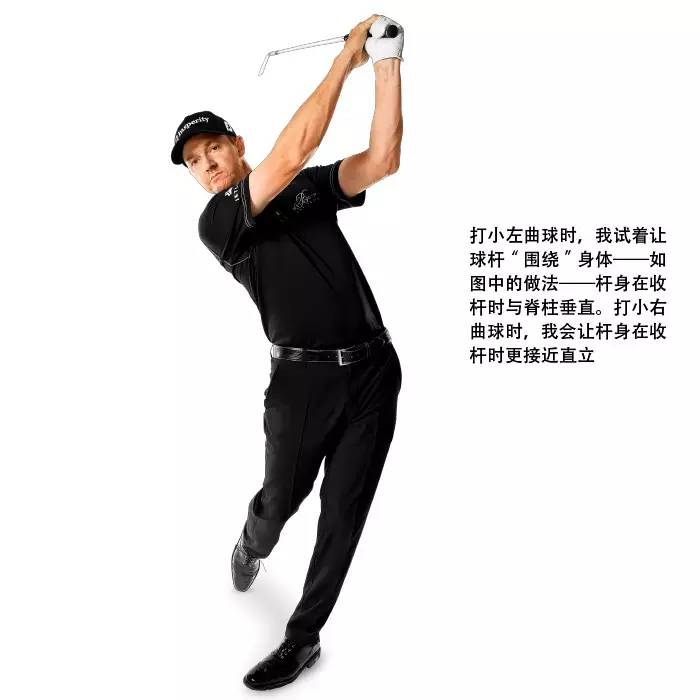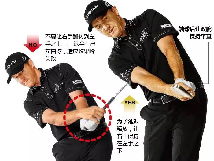 释放动作是这类击球的重要元素。当你挥杆通过球位时,试着不要让右手翻转到左手之上。练习时,我会训练触球后让双腕保持平直(右图)。这是终极抗左曲释放,它能保证打出自左向右的球旋。直腕式小右曲球不仅适用于传统的得分球杆,也适用于长铁杆。它曾不止一次救我于危难中,相信我。