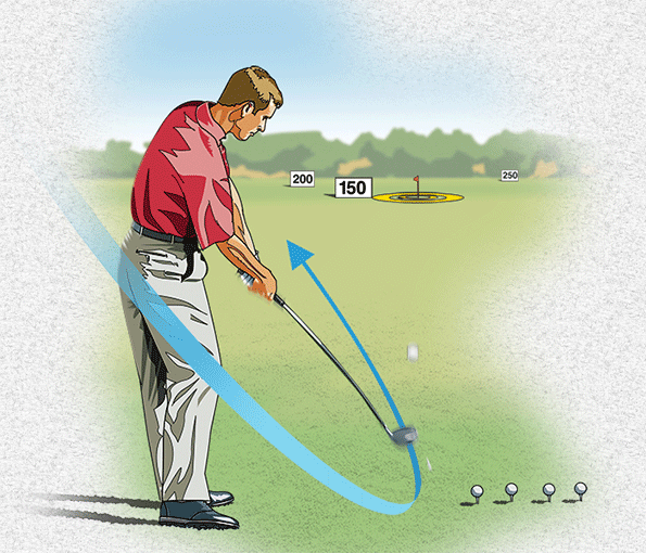 要提高以标准杆上果岭比率,首先要提高上球道成功率:在发球台这种短草区,与长草区相比,更容易实现稳固触球,控制击球距离。在热身时,架5个球,争取使用1号木杆打出150码。这会迫使你以标准速度的60-70%来挥杆。在第1洞发球台复制这种感觉,以大约80%的速度来挥杆。你的斗志将会弥补击球距离,而放慢挥杆速度有助于保持控制,提高准确性。