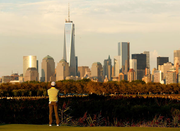 在自由国家球场的球道上挥杆,可以眺望自由女神以及曼哈顿的天际线