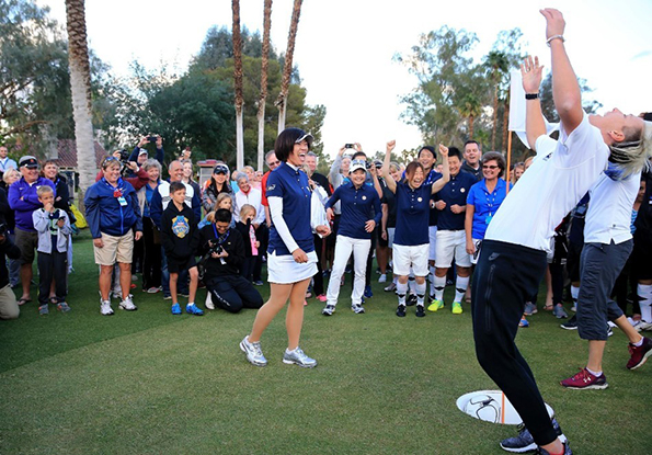 年度首场女子大满贯全日空锦标赛开杆之前,一场美国队与日本队的足球高尔夫表演赛率先上