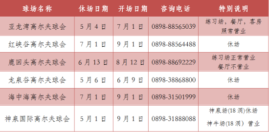 此次区域轮流休场,主要以6家球场的地域性差异为考量,在不影响各旅游区域高尔夫元素缺失的前提下,安排各区域球场轮流休场,尽可能满足来三亚的游客及本地球友需求;另一方面也希望从一定程度上将有限的打球客人集中到区域内的一家球场,提高营业球场的使用率;同时,休场的球场利用休场时间进行球场养护,员工休整,在旺季到来之际,为前来三亚的高尔夫爱好者提供更优质的球场,营造难忘的打球体验。