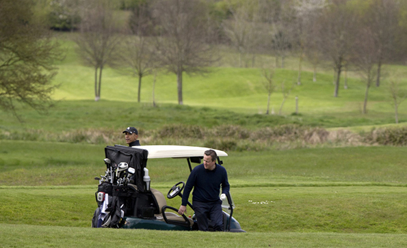 美国总统奥巴马和英国首相戴维-卡梅伦在一家位于伦敦北部的球场打了一场高尔夫球,这也是他海外繁忙之旅中安排的最喜欢的周末休闲时光。