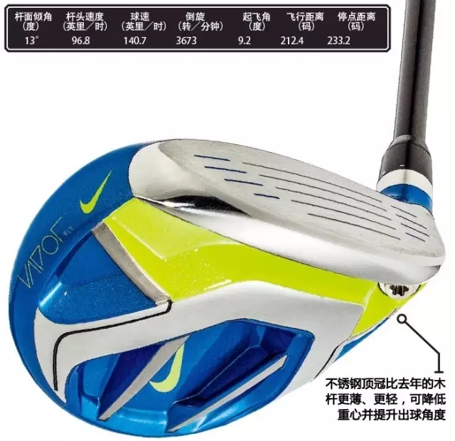 外观:中号杆头除了外形传统其余均彰显狂野;铁蓝色顶冠和荧光绿的Nike标志与银色杆面形成反差。