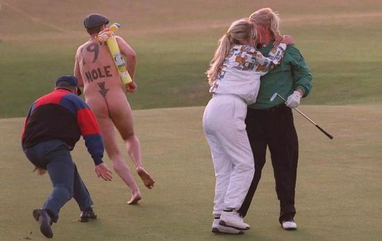 “不过作为一名职业裸奔者,我从来不会干扰比赛。只有当确认达利最后一推进洞赢得冠军时,我才一跃而出跨过栅栏,飞速向他跑去。我原本是打算与他握手的,却没想到还有一个人也在我身边跑——达利的老婆!她费解地看着我,好像在想‘见鬼这家伙到底要干什么’。最要命的是,这女人跑得比我还快,赶在我之前就扑到了她老公身边,这彻底毁了我的计划!”